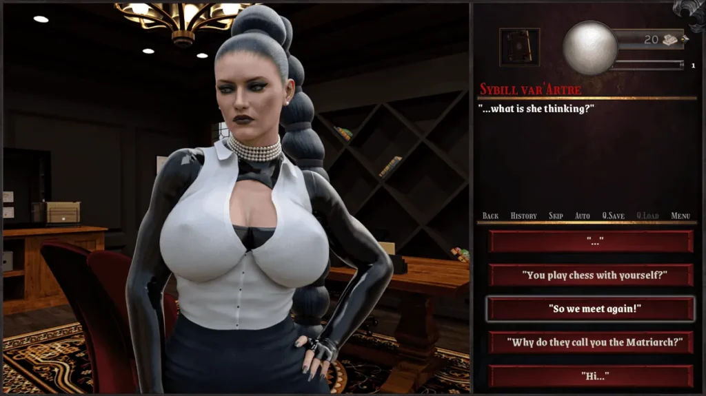 | Lady Valerius | Dominant Futa Aristocrat | Calculating, politically savvy, uses etiquette as a weapon. Expect mind games and refined control. | Progress the main story and attend the Soirée at the Manor. |